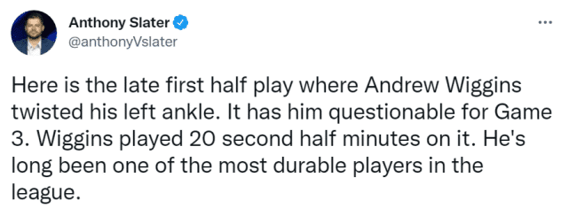 JRS低调看直播05月22日讯 ,西决G3的伤病报告上,维金斯左踝酸痛,被列为questionable(出战成疑,上场可能性50%)。勇士跟队记者Slater也晒出了维金斯受伤的一幕。他在G2上半场还剩2分24秒时扭到了左脚。