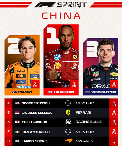 JRS低调看直播讯 北京时间3月22日,2025赛季F1中国大奖赛今日进行了冲刺赛的争夺。杆位发车的汉密尔顿夺得冠军,皮亚斯特里超越维斯塔潘获得第二名,维斯塔潘第三,诺里斯仅获得第八名。
