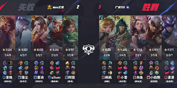 第三局,比赛伊始,Hero久竞的Silver使用公孙离击杀入侵的阿古朵,拿下一血。4分钟,Hero久竞集火击杀廉颇后夺得暴君。5分钟,广州TTG在上路成功击杀对方射辅组合。9分钟,Hero久竞的景诗弈星闪现开团,景晚关羽趁机进场,Hero久竞击杀四人并入侵红区。11分钟,Silver的公孙离打出二连击破,队伍拿到暗影暴君还破掉中路一塔。后续,Hero久竞多次控下关键资源,团战也占据上风。18分钟,凭借暗影先锋,Hero久竞强点水晶,成功扳回一局。本局MVP为Hero久竞_Silver (黄本帅)公孙离!