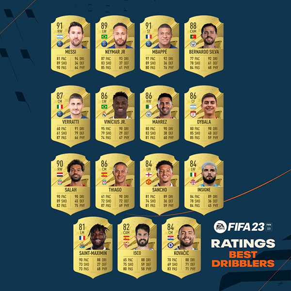 JRS低调看直播讯 9月18日讯 EA公布FIFA23盘带TOP15,梅西94居首,内马尔93第二,姆巴佩、B席92并列第三。