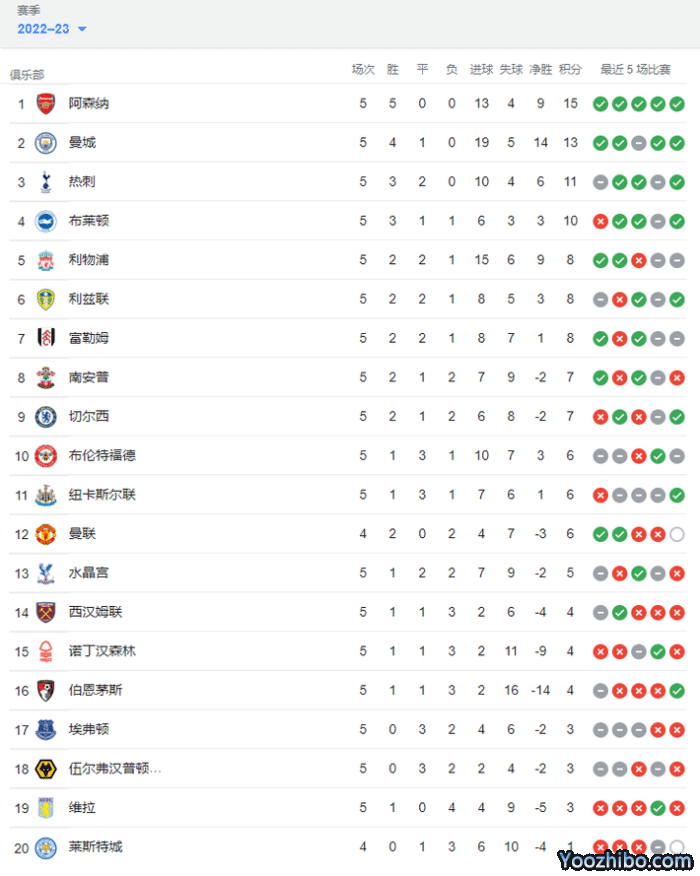 阿森纳开局5轮全胜,积15分排名第一,曼城4轮4胜1平13分第二,热刺5轮3胜2平11分第三。